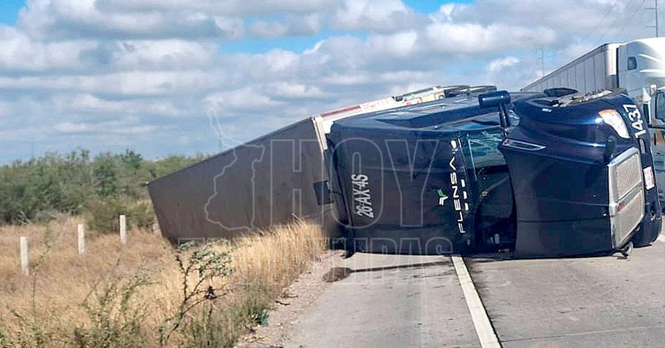 Nuevo Laredo, Tamaulipas. — Un repentino malestar físico provocó que un trailero perdiera el control de su pesada unidad y terminara volcado sobre el Libramiento Mex 2 de Nuevo Laredo.