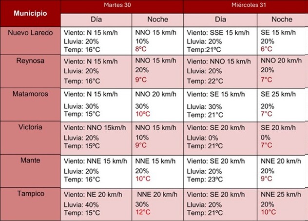 Ciudad Victoria, Tamaulipas.-El frente frío número 25, impulsado por una masa de aire ártico, continuará afectando a Tamaulipas a partir de este martes, con un descenso moderado a fuerte de temperatura, además de vientos intensos asociados al evento de “Norte”, informó la Coordinación Estatal de Protección Civil.