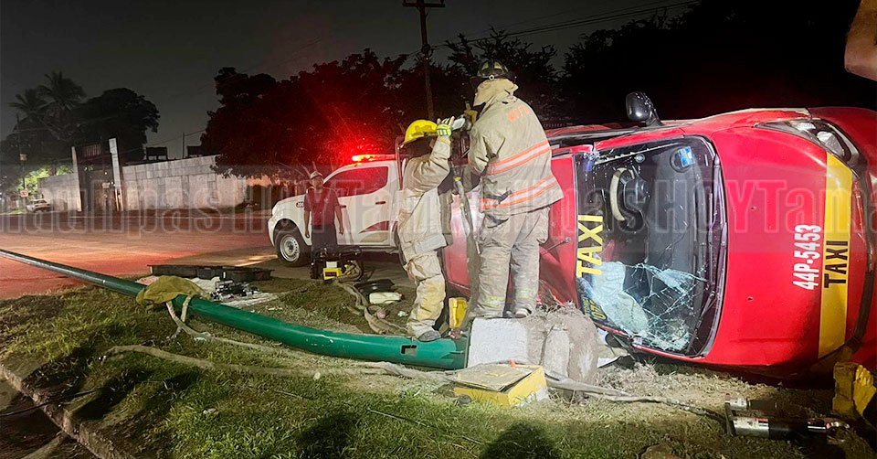 Taxista lesionado al volcar tras chocar y derribar un poste en Altamira