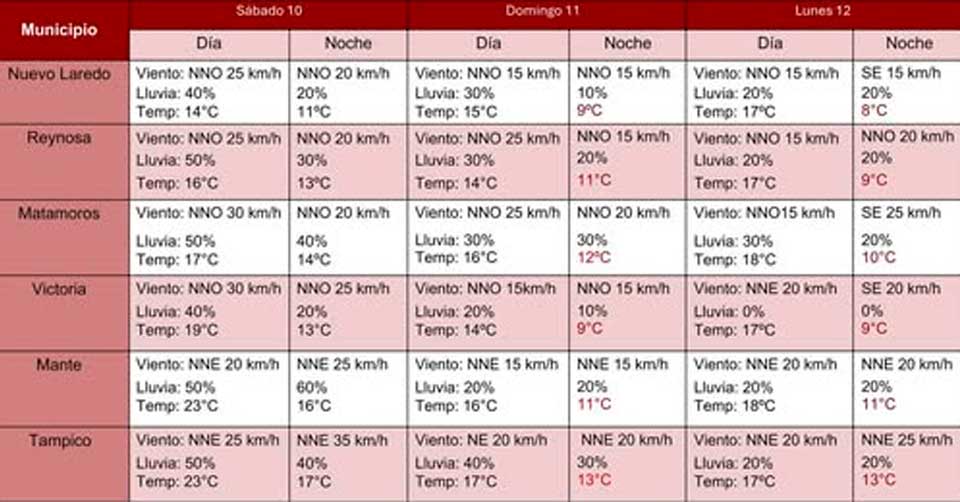 Ciudad Victoria, Tamaulipas.- El frente frío número 27, impulsado por una masa de aire polar-ártico, impactará de lleno a Tamaulipas a partir de la madrugada del sábado, provocando un evento climático severo que incluye ráfagas de viento de hasta 80 km/h en tierra, velocidades de 80 a 100 km/h en el Golfo de México, oleaje elevado de 3 a 5 metros, así como un marcado descenso de temperaturas en todo el Estado.