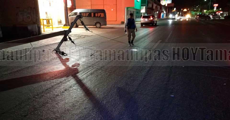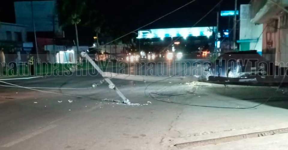 Tampico, Tamaulipas.-Un aparatoso accidente vial se registró durante la madrugada de este día, luego de que el conductor de un automóvil se estrellara contra un poste de concreto que sostenía cables de energía eléctrica, el cual fue derribado.