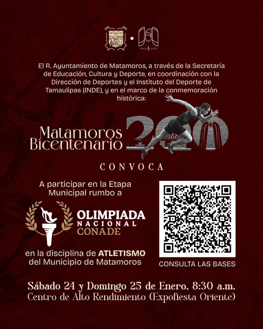 H. Matamoros, Tamaulipas.– Matamoros será escenario este mes de la etapa municipal de atletismo rumbo a la Olimpiada Nacional CONADE, una competencia que permitirá detectar y proyectar a jóvenes talentos deportivos de la ciudad.