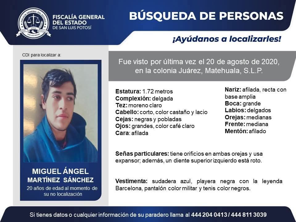 San Luis Potosí. - La Fiscalía General del Estado de San Luis Potosí emitió un boletín de búsqueda para localizar a Miguel Ángel Martínez Sánchez, quien fue visto por última vez el 20 de agosto de 2020 en la colonia Juárez, en el municipio de Matehuala.