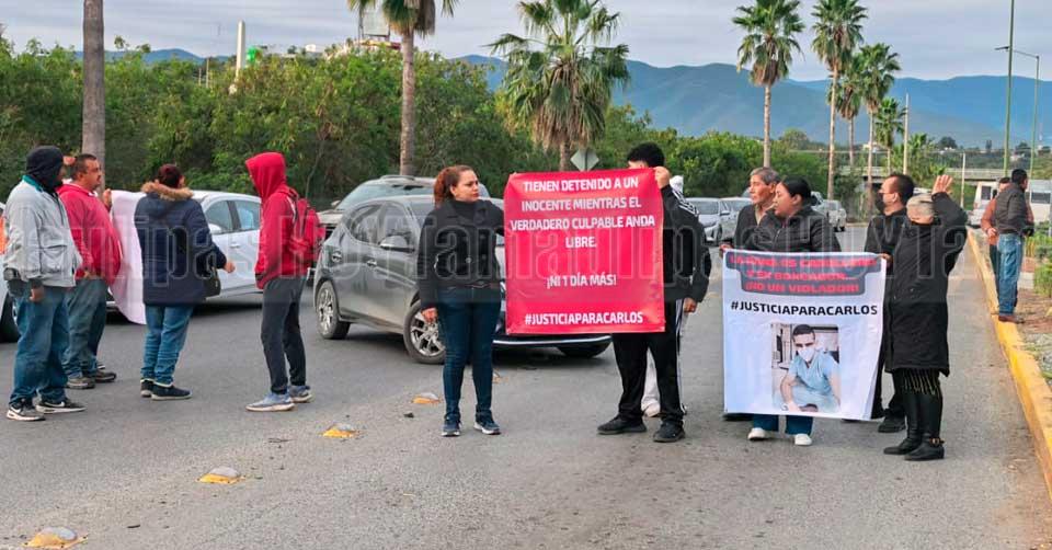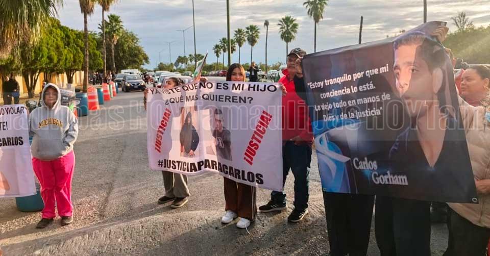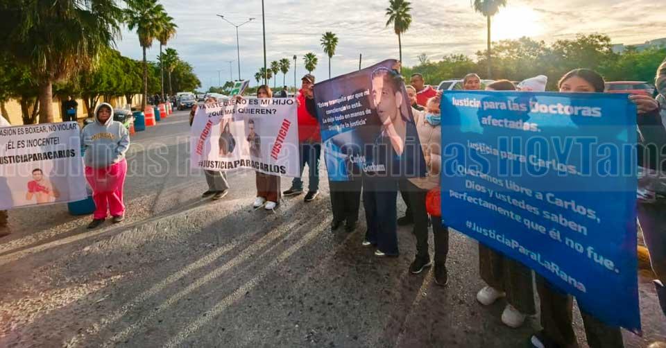 Con pancartas y consignas, los manifestantes demandaron la intervención directa del gobernador Américo Villarreal Anaya, a quien exigieron que “les diera la cara” y revisara el caso, al asegurar que Carlos es inocente de los hechos que se le imputan.