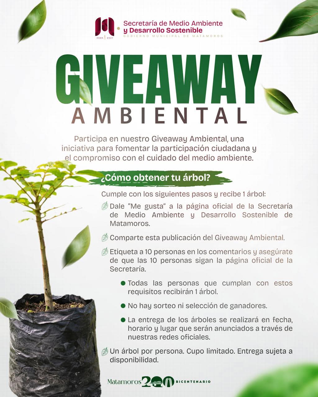Matamoros, Tamaulipas.– El Gobierno de Matamoros, a través de la Secretaría de Medio Ambiente y Desarrollo Sostenible, inició el denominado Giveaway Ambiental, un programa mediante el cual se entregarán árboles a la población para su plantación en viviendas, escuelas y espacios comunitarios.