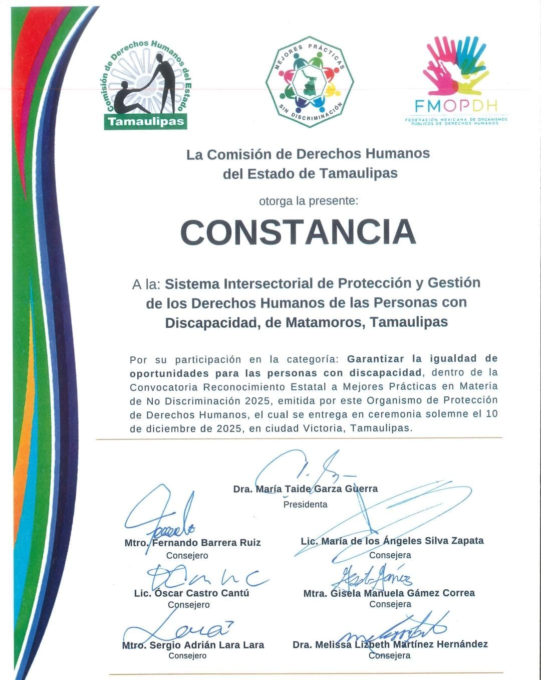 H. Matamoros, Tamaulipas.- El Gobierno Municipal de Matamoros, encabezado por el alcalde Beto Granados, recibió un reconocimiento estatal por parte de la Comisión de Derechos Humanos del Estado de Tamaulipas, por las acciones encaminadas a garantizar la igualdad de oportunidades para las personas con discapacidad.