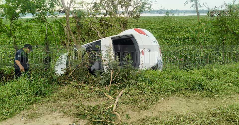 Las autoridades presumen que el conductor perdió el control del volante y se salió a su derecha, quedando la unidad volcada sobre un costado en un área pantanosa y a unos metros de la laguna, en donde los ocupantes lograron salir por su propio pie.