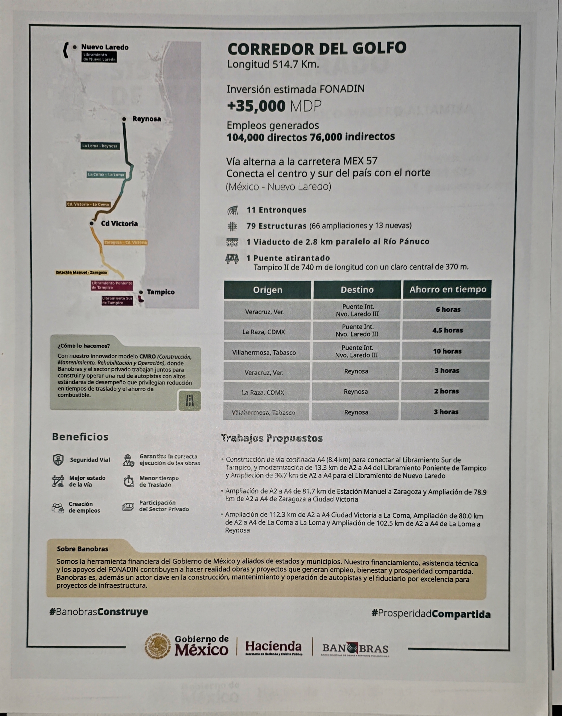 Ciudad Victoria, Tamaulipas. – El proyecto carretero Corredor del Golfo se perfila como una de las obras de infraestructura más relevantes del noreste del país, al contemplar una longitud total de 514.7 kilómetros y una inversión estimada superior a los 35 mil millones de pesos, a través del Fondo Nacional de Infraestructura (FONADIN).