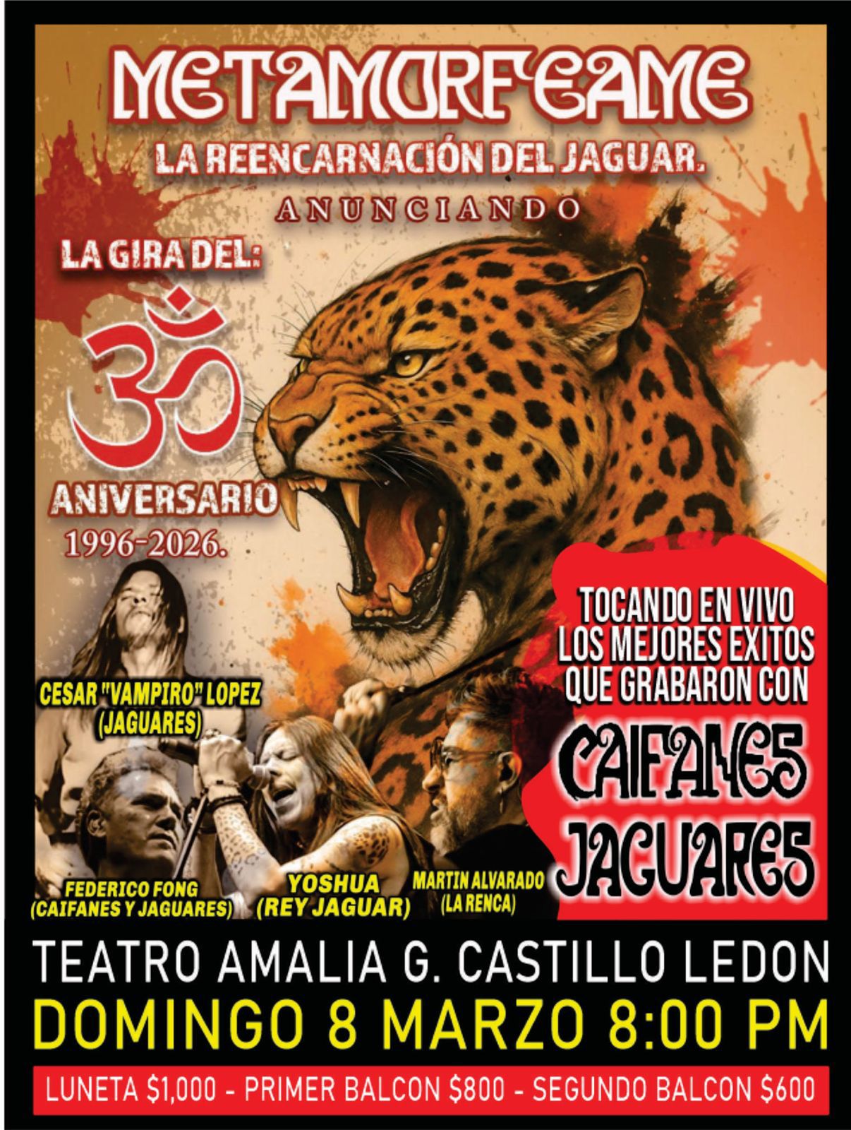 Ciudad Victoria, Tamaulipas.- Para los amantes del buen rock, llega a Ciudad Victoria la gran gira del 30 aniversario “Metamorfeame, la Reencarnación del Jaguar” con sus integrantes originales de los grupos Caifanes y Jaguares, tocando los mejores éxitos, el próximo domingo 8 de marzo a las 8 de la noche en el Teatro Amalia G Castillo Ledon, sin lugar a dudas es la oportunidad para quienes crecieron con esta música y de los más jóvenes que gustan de este género de vivir una experiencia inolvidable.