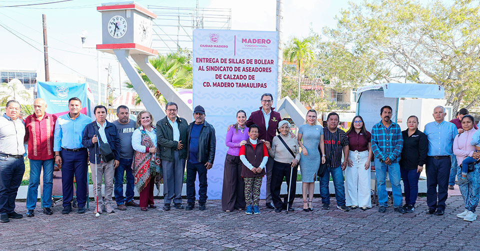 Ciudad Madero, Tamaulipas. - Para dignificar las condiciones de trabajo de quienes diariamente ofrecen sus servicios en el primer cuadro de la ciudad, el presidente municipal, Erasmo González Robledo, acompañado por su esposa, la presidenta del Sistema DIF Madero, Lic. Dunia Marón Acuña, realizó la entrega de ocho sillas de bolear a trabajadores pertenecientes al Sindicato de Aseadores de Calzado de Ciudad Madero, quienes se ubican alrededor de la presidencia municipal.