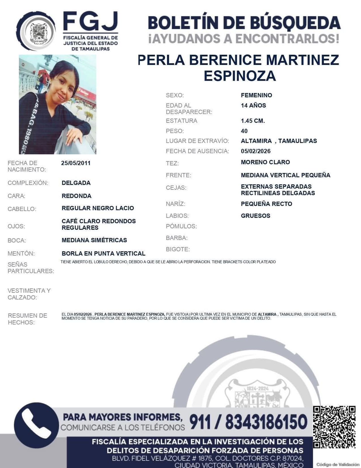 Se trata de Perla Berenice Martínez Espinoza, de 14 años de edad, quien fue vista por última vez el 5 de febrero de 2026 en este municipio. Desde entonces, sus familiares no han tenido noticias sobre su ubicación.
