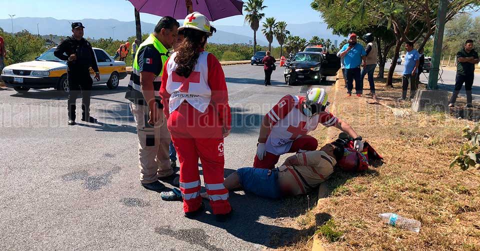 El accidente ocurrió en la prolongación del Bulevar Praxedis Balboa y calle Tula, donde se registró un choque por alcance entre un automóvil Chevrolet Aveo negro, con placas XJJ-436-D, y la motocicleta.