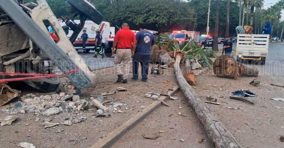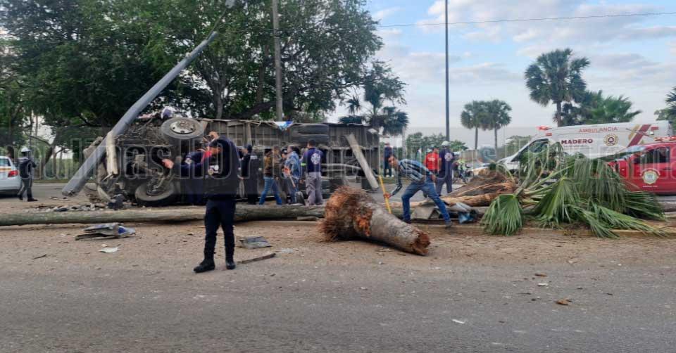 Tampico, Tamaulipas.-En forma impresionante un autobús de la ruta Serapio Venegas-Tampico que no llevaba pasajeros y circulaba con evidente exceso de velocidad, al quedarse sin frenos se impactó contra un poste del servicio de alumbrado público y una palmera ubicados en el camellón, a los cuales derribó, para terminar volcado sobre un costado.