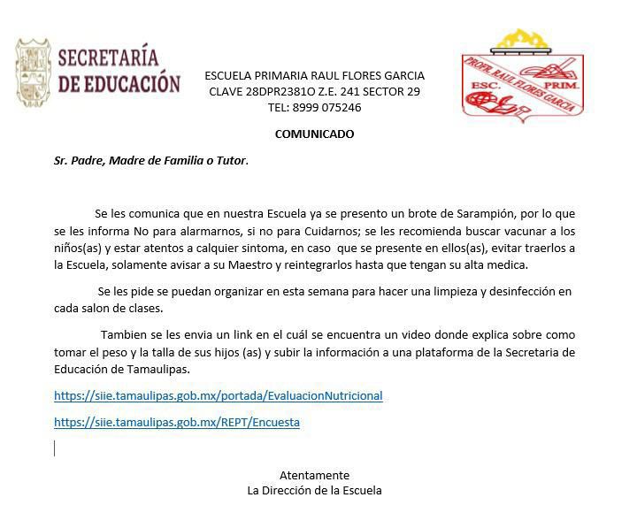 Reynosa, Tamaulipas. – Directivos de la escuela primaria Raúl Flores García informaron a la comunidad escolar sobre la detección del primer brote de sarampión en el plantel, con el objetivo de mantener informados a los padres de familia y reforzar las medidas preventivas de salud.