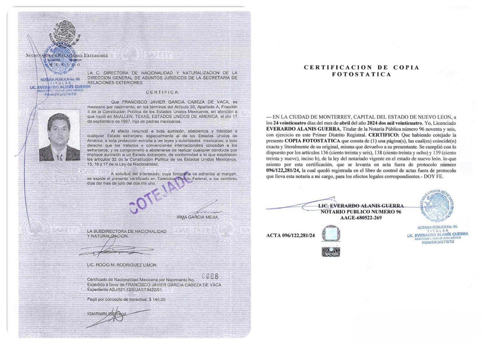 Entre los documentos exhibidos se encuentra un certificado de nacionalidad mexicana por nacimiento, expedido por la Secretaría de Relaciones Exteriores, en el que se establece que García Cabeza de Vaca renunció expresamente a toda sumisión, obediencia y fidelidad a cualquier Estado extranjero, así como a la protección de leyes, autoridades, tratados o convenciones internacionales que pudieran beneficiarlo como extranjero.