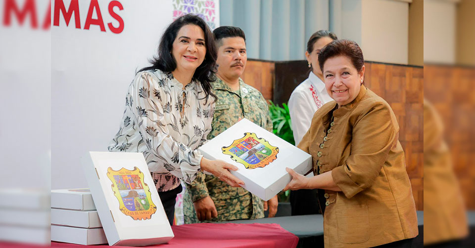 Tampico, Tamaulipas. - En el marco de la conmemoración del centenario del Himno a Tamaulipas, la presidenta municipal de Tampico, Mónica Villarreal Anaya, encabezó la ceremonia de entrega del lienzo del Escudo de Armas de Tamaulipas a 46 instituciones públicas del Gobierno Estatal y Municipal.