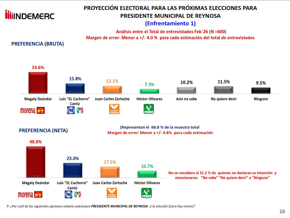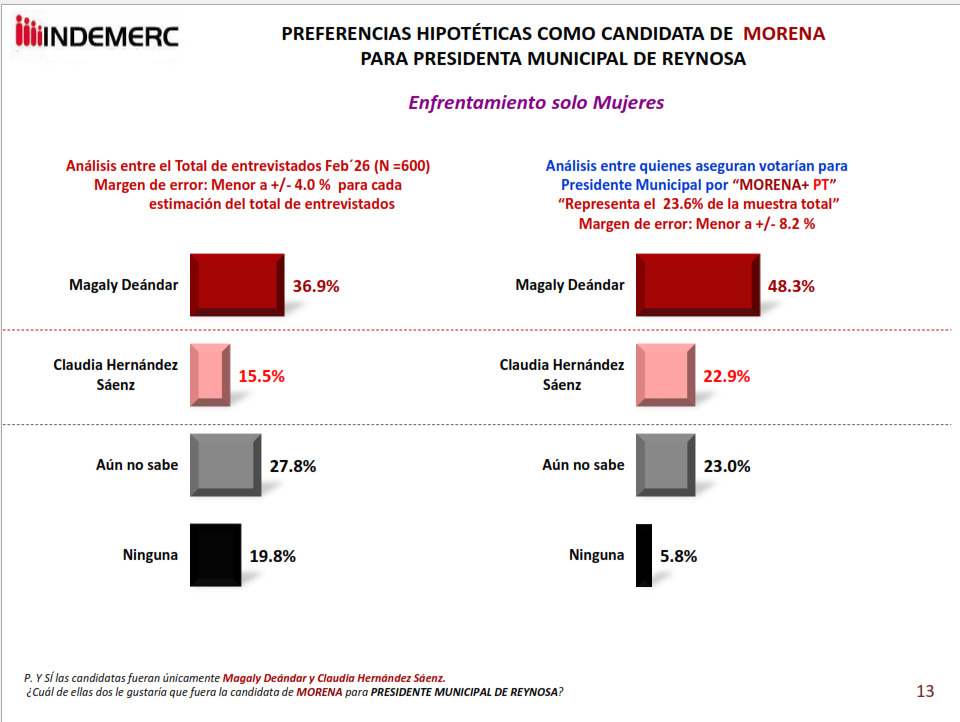 En la medición aplicada del 13 al 15 de febrero de 2026, con 600 entrevistas telefónicas en Reynosa y un margen de error de ±4%, Magaly Deándar obtiene 36.9% de preferencia bruta contra 15.5% de Hernández. Sin embargo, el dato políticamente más relevante se ubica en el segmento decisivo: quienes aseguran votar por Morena y el PT. En ese universo, Deándar alcanza 48.3% frente a 22.9% de Hernández, lo que representa una ventaja cercana a dos a uno.