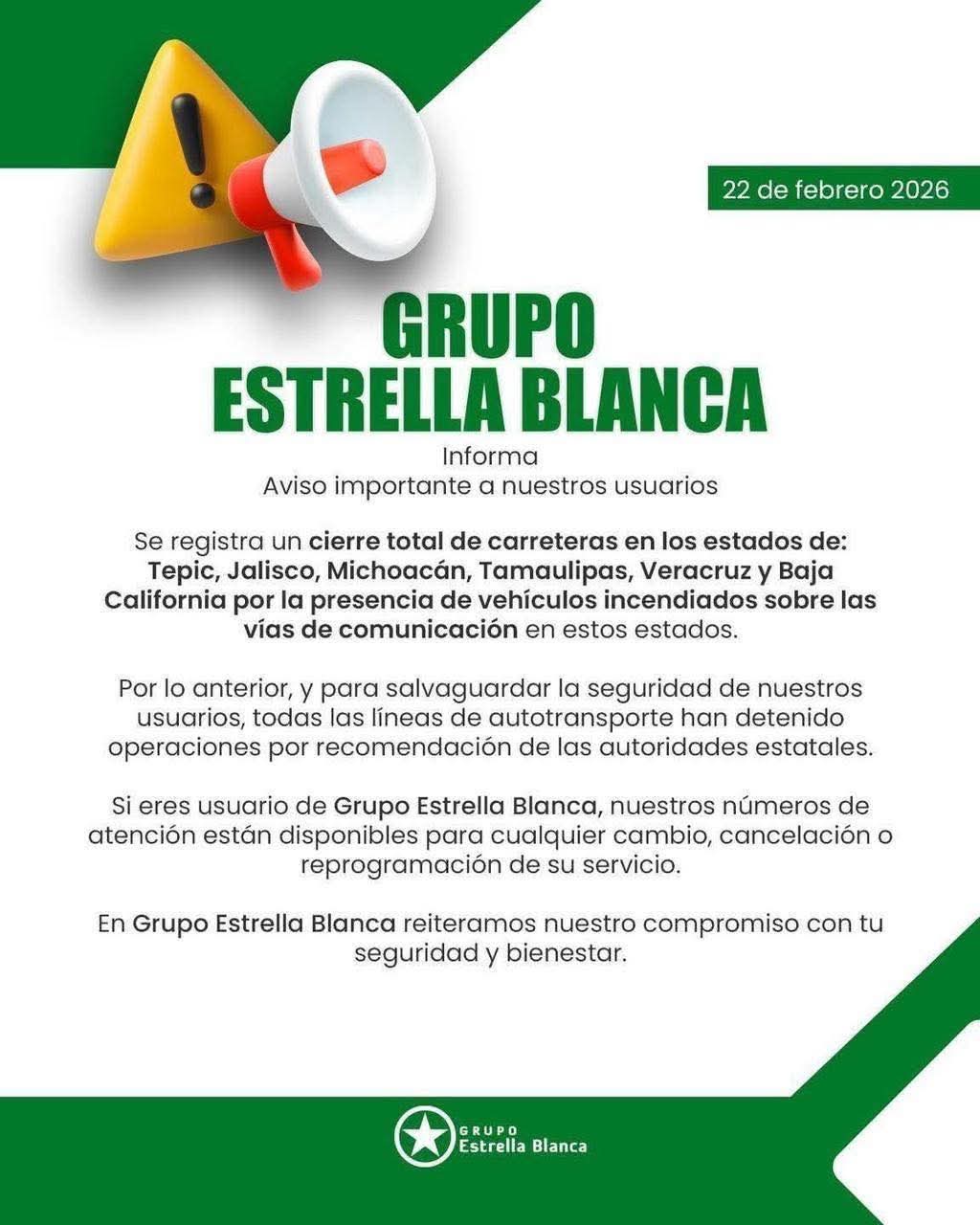 La interrupción de operaciones se deriva de las situaciones de riesgo generadas esta mañana con bloqueos en varias partes del país, entre ellas Reynosa, tras la detención de “El Mencho”, quien posteriormente murió, lo que provocó un reforzamiento de los operativos de seguridad en los estados mencionados.