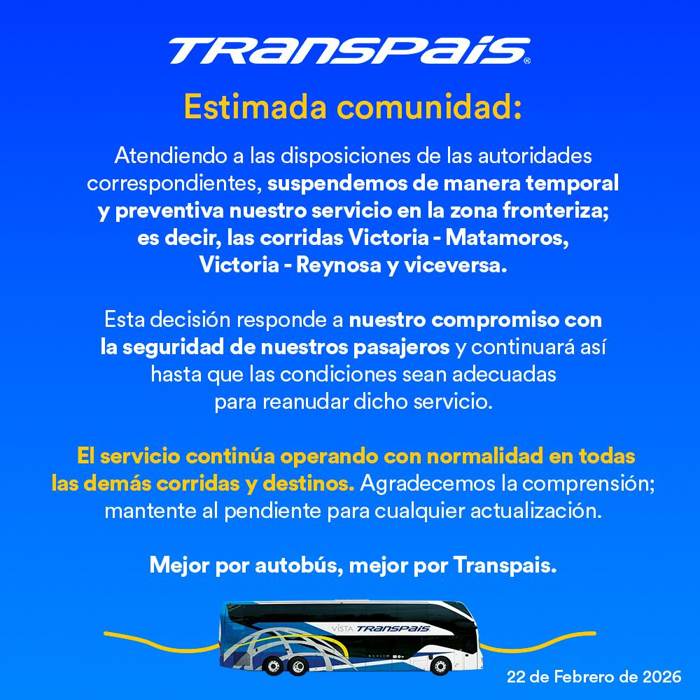 Ciudad Victoria, Tamaulipas. - Empresas de transporte de pasajeros como Transpaís, ETN y el grupo Estrella Blanca informaron la suspensión temporal y preventiva de sus corridas en Tamaulipas y otros estados del país, como medida de seguridad ante los recientes hechos de riesgo, derivados de la detención en Jalisco de “Rubén “N”, líder de un grupo criminal, quien murió cuando era trasladado vía aérea a la Ciudad de México.