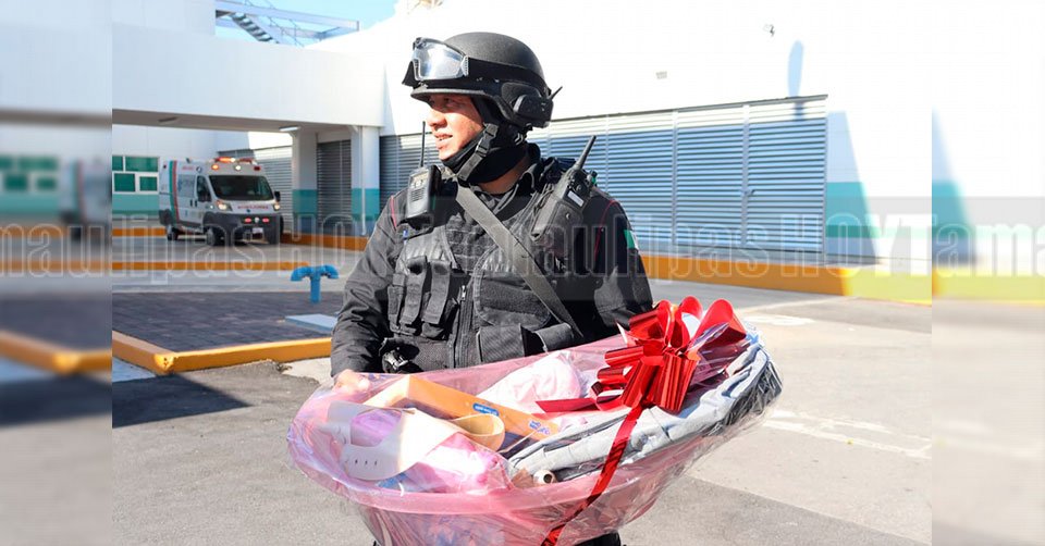 Tras el nacimiento y una vez garantizado el bienestar de la mujer y la menor, la Secretaría de Seguridad Pública de Tamaulipas, en representación de su titular, realizó la entrega a la familia de diversos artículos para bebé.