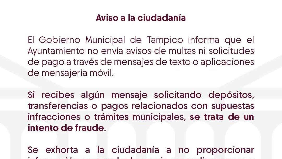 Tampico, Tamaulipas. - El Ayuntamiento de Tampico alertó a la población que no está enviando notificaciones de multas ni solicitudes de pago a través de mensajes de texto ni por aplicaciones de mensajería instantánea.