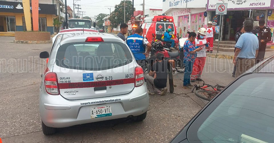 Tampico, Tamaulipas. – Un ciclista de 19 años resultó lesionado luego de circular en sentido contrario e impactarse contra un automóvil del transporte público en la colonia Vergel, de Tampico.