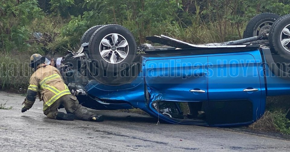 La unidad involucrada es una camioneta JAC color azul, doble cabina tipo pick-up con placas de Tamaulipas, la cual terminó llantas arriba después de que el conductor perdiera el control al tomar la pronunciada curva.