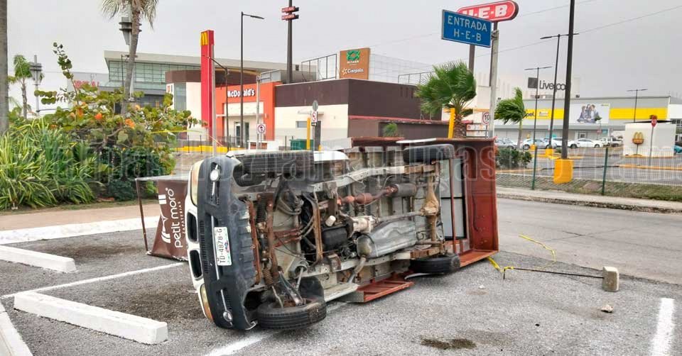 Tampico, Tamaulipas.-De forma impresionante, las fuertes rachas de viento provocaron la volcadura de una camioneta al servicio de una empresa publicitaria frente a Plaza Covadonga, en Tampico.