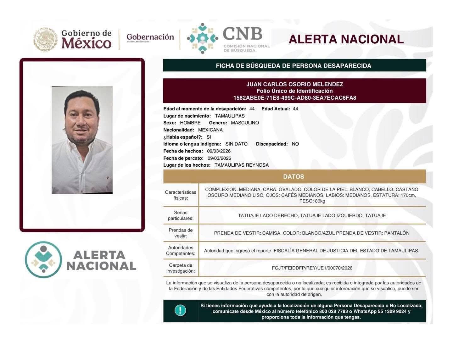 A través de la ficha de búsqueda se solicita la colaboración de la ciudadanía para aportar cualquier información que ayude a localizarlo. Osorio Meléndez laboraba en el área administrativa de la Secretaría del Ayuntamiento de Reynosa.