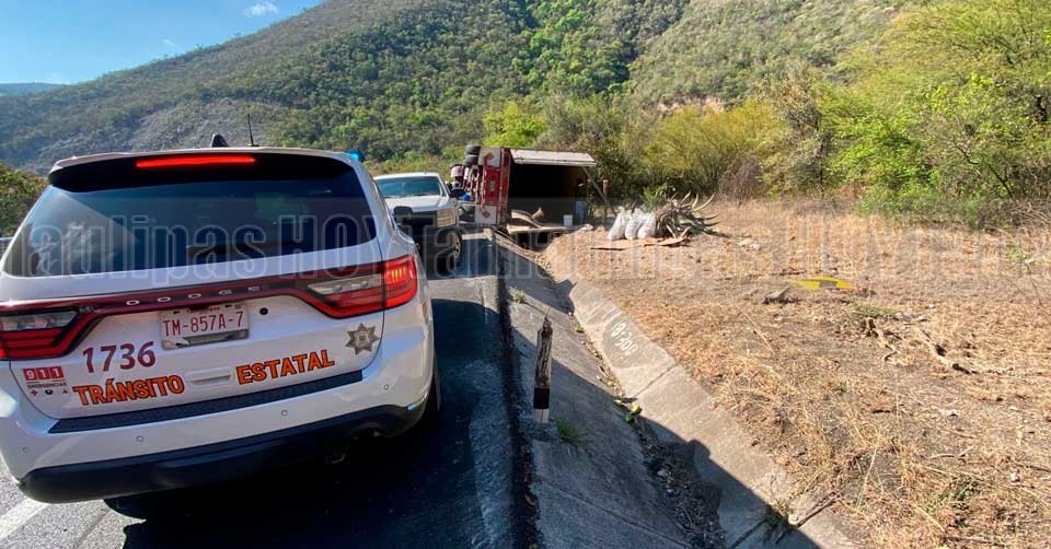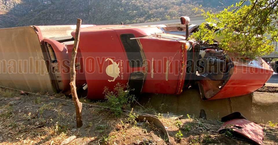 Ciudad Victoria, Tamaulipas. – Un tráiler Kenworth que transportaba varias toneladas de pepino volcó en el kilómetro 18+300 de la carretera Rumbo Nuevo, cuando circulaba de sur a norte con destino a la frontera del Estado.