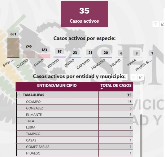 A nivel nacional, se han confirmado mil 190 casos activos en distintas especies: 681 en bovinos, 245 en caninos, 123 en porcinos, 67 en equinos, 23 en ovinos y 20 en humanos.