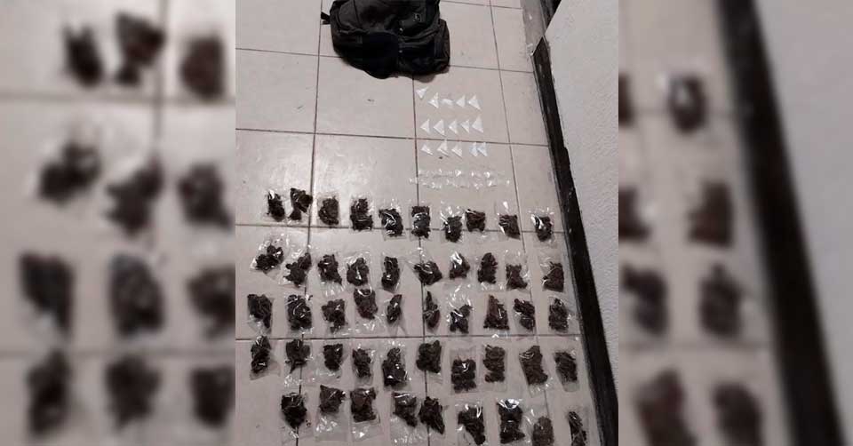 Entre lo asegurado había sustancias con características de marihuana, cocaína y una sustancia sólida blanca, presumiblemente cristal, lo que apunta a actividades de narcomenudeo.