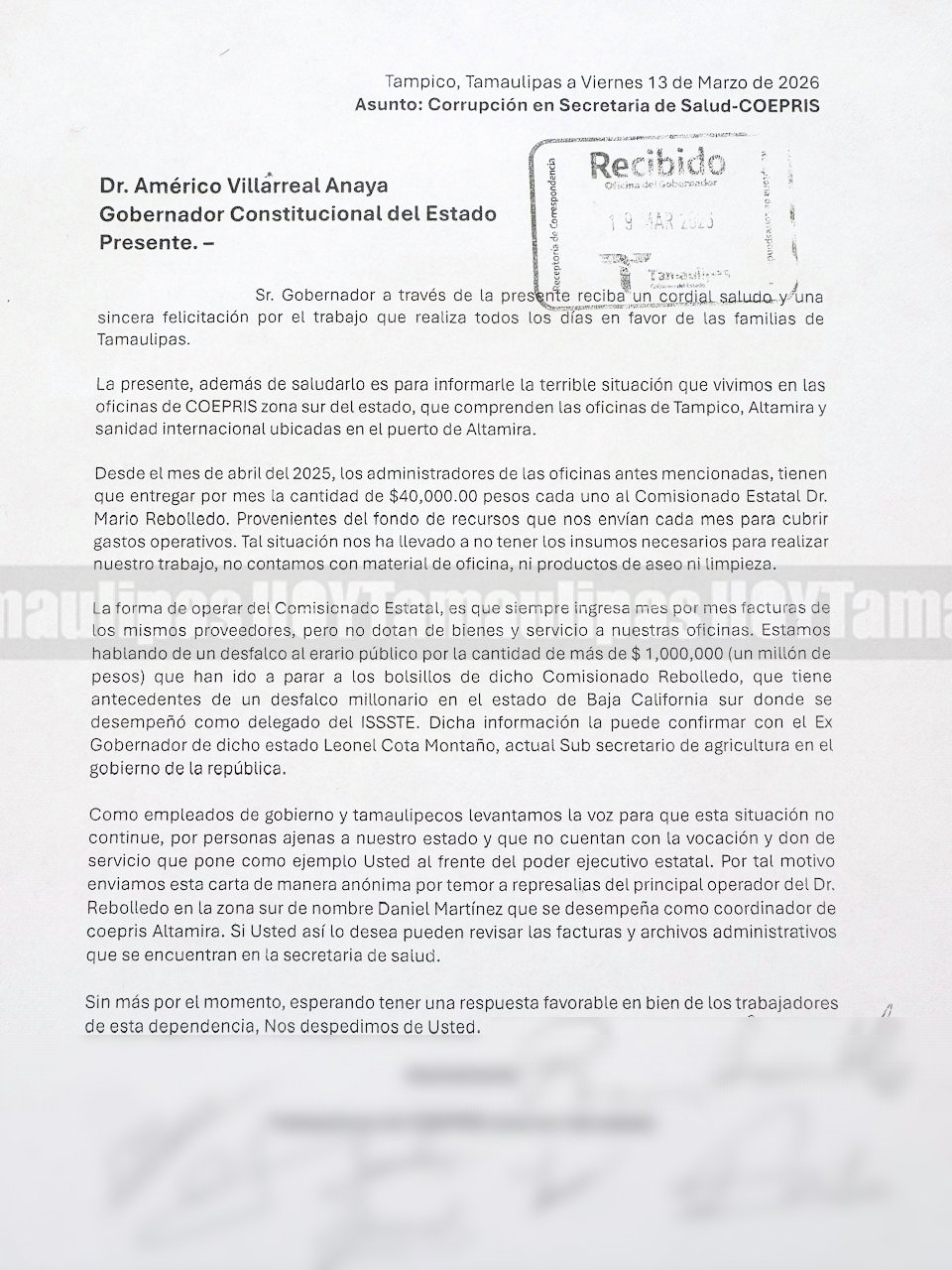 El documento, fechado el 13 de marzo de 2026 en Tampico y recibido en la Oficina del Gobernador, y del cual HOYTamaulipas cuenta con una copia, señala que administradores de las oficinas de Tampico, Altamira y sanidad internacional en el puerto de Altamira estarían obligados a entregar mensualmente 40,000 pesos cada uno al comisionado estatal, identificado como Mario Rebolledo.