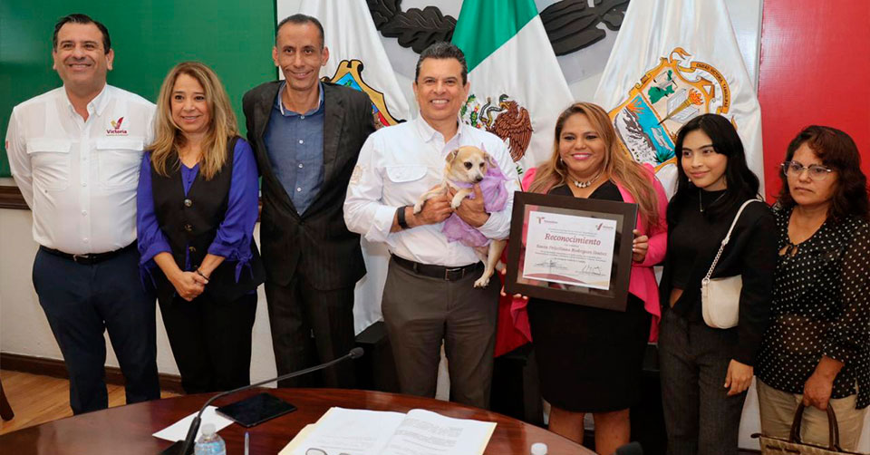Ciudad Victoria, Tamaulipas. - A nombre del Cabildo de Victoria, el alcalde Eduardo Gattás Báez entregó reconocimiento a Santa Prisciliana Rodríguez Ibáñez por su destacada trayectoria en la lucha social y su incansable labor humanitaria en el cuidado y protección de los animales en esta Capital.