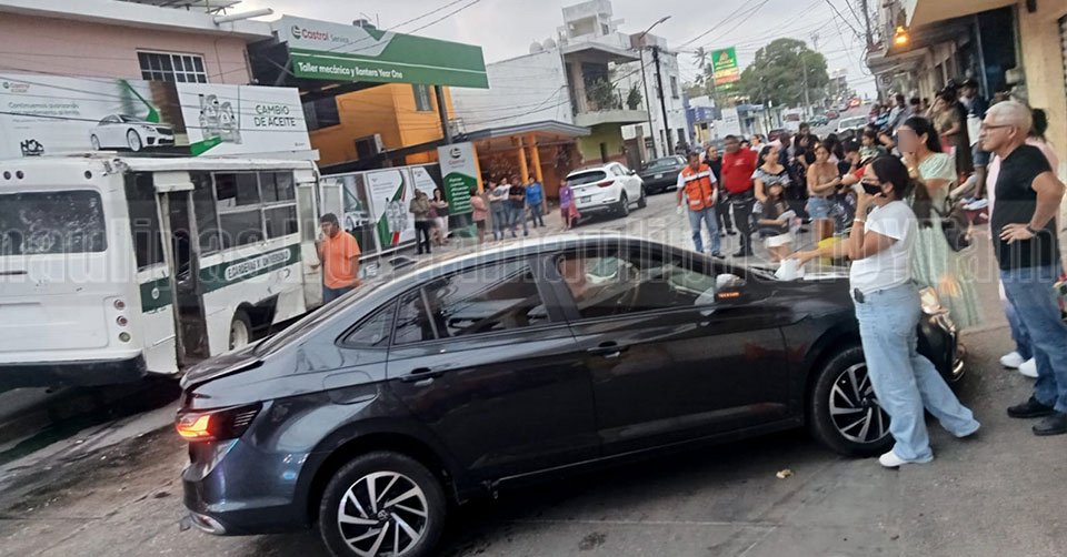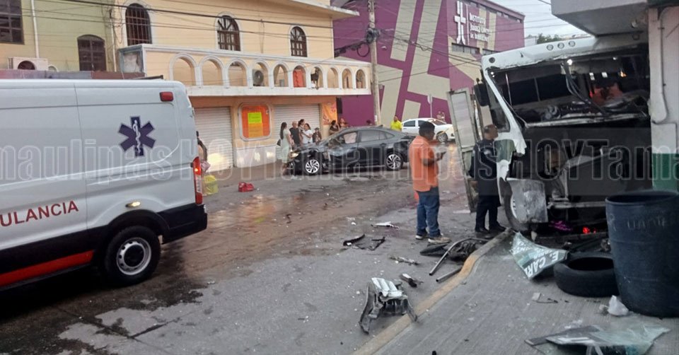 Tampico, Tamaulipas. - Al menos 11 personas resultaron lesionadas tras un aparatoso choque entre un automóvil particular y un microbús del transporte público, el cual terminó proyectado contra la fachada de una refaccionaria en la colonia Tolteca, en Tampico.