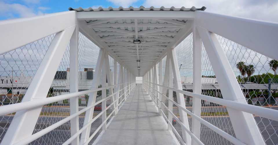 Este puente incluyó la instalación de columnas principales para soporte del piso, armazón metálico para el túnel, postes para elevar la altura de cables, lámina acanalada y losacero, además de pintura de esmalte, barandal metálico, malla de protección, guarniciones, banquetas y sistema de alumbrado.