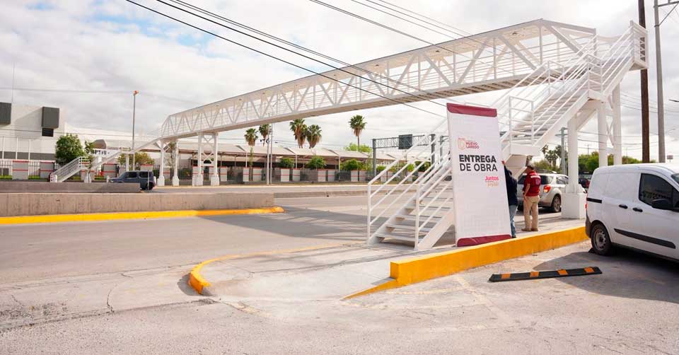 Nuevo Laredo, Tamaulipas.-Atendiendo una demanda prioritaria de seguridad para peatones en una de las vialidades con mayor flujo de la ciudad, la alcaldesa Carmen Lilia Canturosas Villarreal encabezó la entrega de la obra de reubicación del puente peatonal en Calzada de los Héroes, entre Manuel Ávila Camacho y Eva Sámano, frente al Parque Industrial J. Longoria.