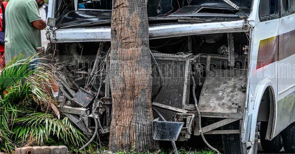 Presuntamente, el accidente se originó por una falla mecánica en la suspensión del microbús, lo que provocó que el conductor perdiera el control y girara hacia su extrema derecha, impactándose contra una palmera y deteniéndose tras un segundo golpe frontal.