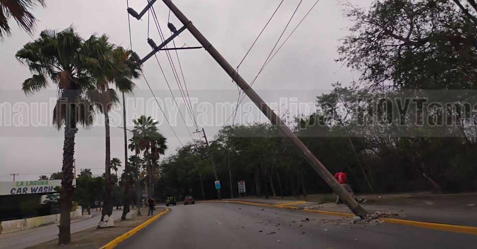 Tampico, Tamaulipas. -En riesgo de venirse abajo quedó un poste de concreto de la Comisión Federal de Electricidad que quedó solamente suspendido por el cableado de energía eléctrica, después de ser impactado y desprendido de su base por veloz automóvil.