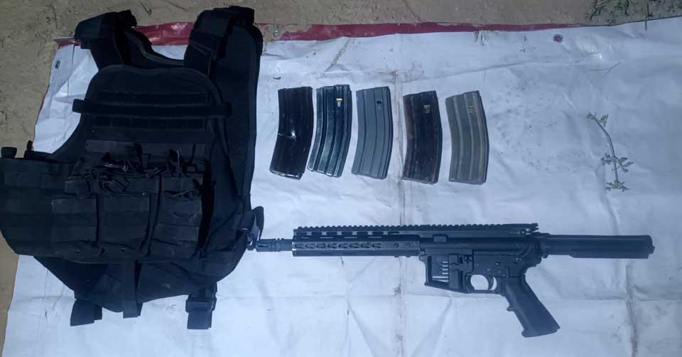 Durante la inspección, los elementos aseguraron un arma larga calibre .223 sin número de serie visible, un chaleco porta placas, dos placas balísticas y cinco cargadores metálicos abastecidos del mismo calibre.