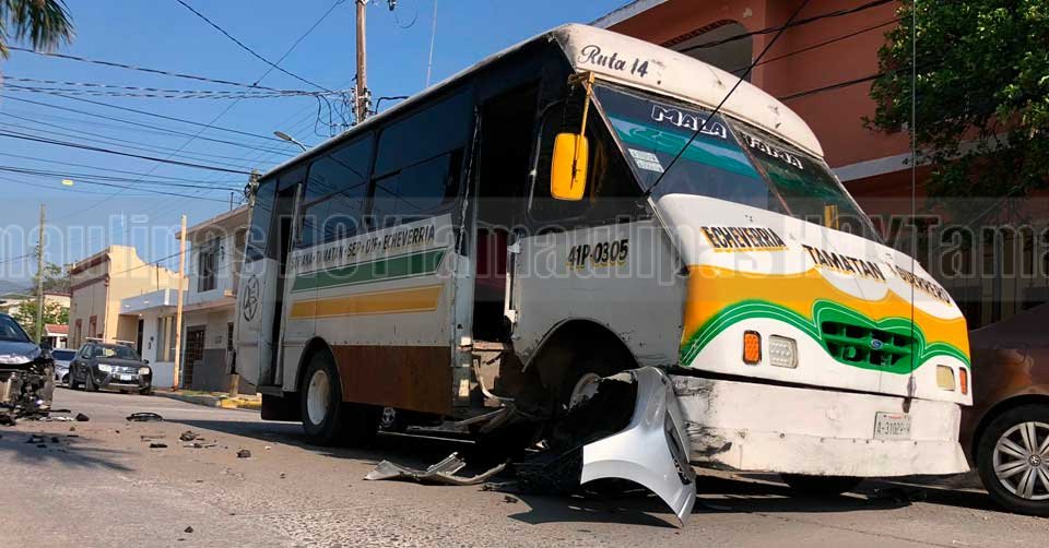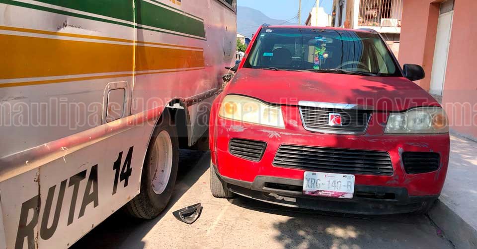 Un microbús y un Jetta chocaron en el cruce del 3 Guerrero en Ciudad Victoria; la unidad de transporte terminó impactando una camioneta estacionada. Solo hubo daños materiales