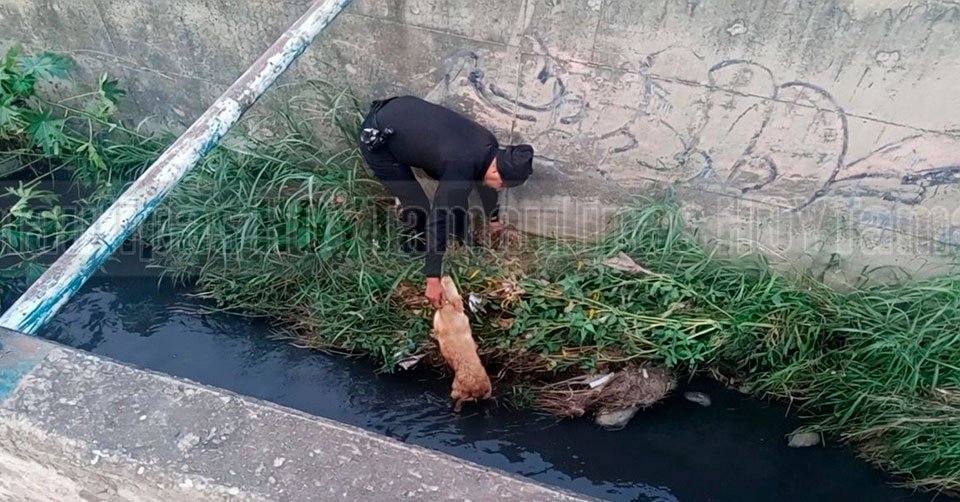 El ciudadano informó que un perro se encontraba dentro del canal y no podía salir, por lo que uno de los elementos descendió al sitio para llevar a cabo las maniobras de rescate.