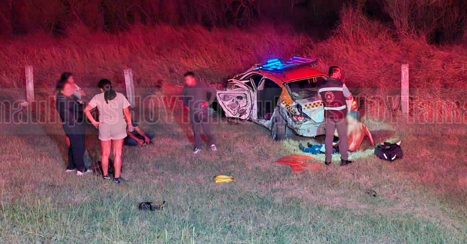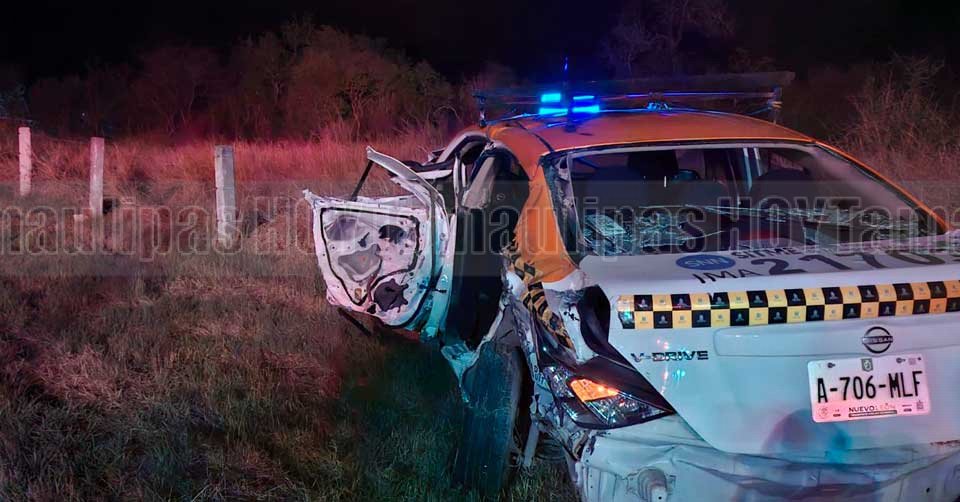 González, Tamaulipas.– Un fuerte choque entre un automóvil habilitado como taxi y un tráiler dejó como saldo cinco personas lesionadas, una de ellas con heridas de consideración que obligaron su traslado al Instituto Mexicano del Seguro Social en Ciudad Victoria.
