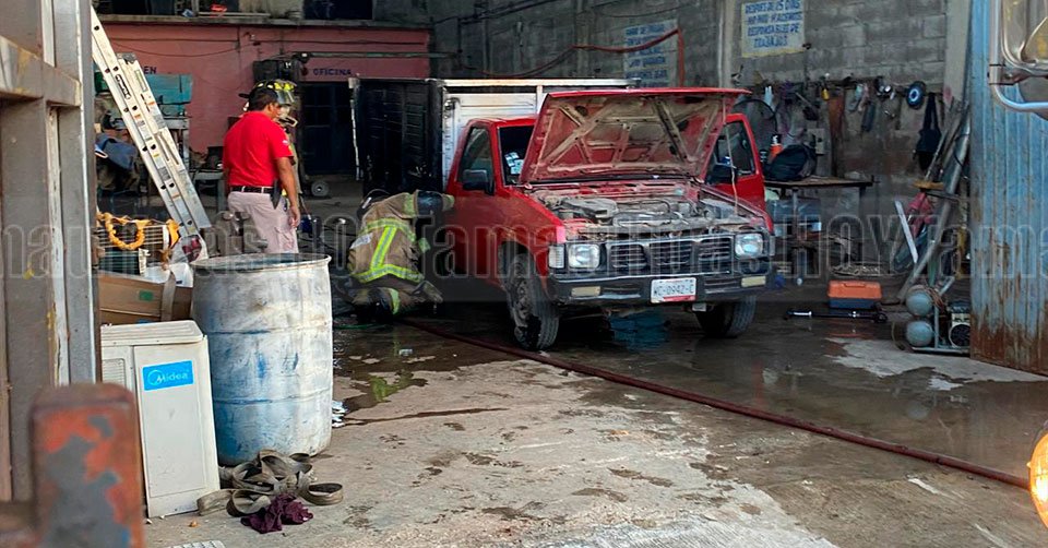 Arde camioneta tipo estaquitas en taller mecánico de Tampico
