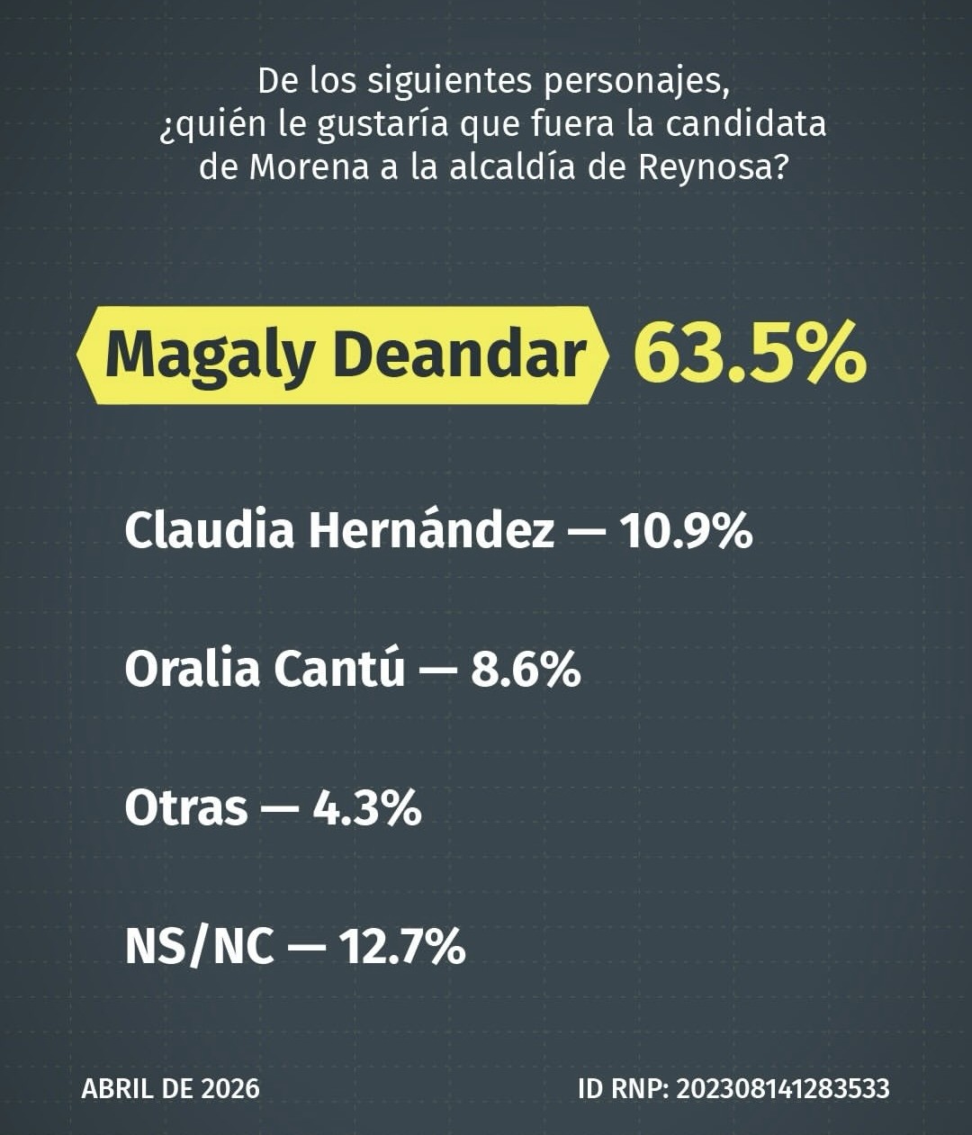 Encuesta de DatoMetría coloca a Magaly Deándar con 63.5% de apoyo en Reynosa, mientras Morena encabeza la preferencia electoral con 52.8% frente a otros partidos