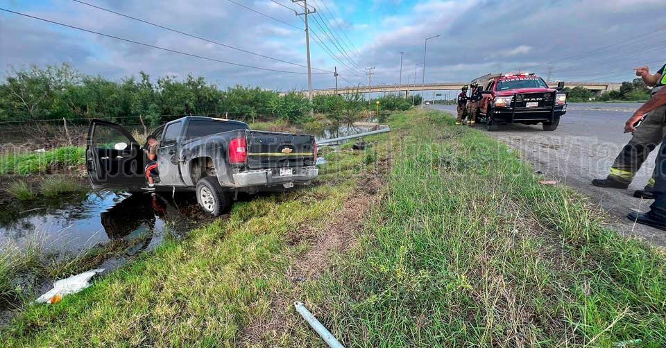 Nuevo Laredo, Tamaulipas. — Un joven de 24 años acabó ileso tras protagonizar un aparatoso accidente en la Carretera a Anáhuac en Nuevo Laredo, donde derribó un poste de alumbrado público y terminó con su camioneta sumergida en un encharcamiento a la orilla del camino.