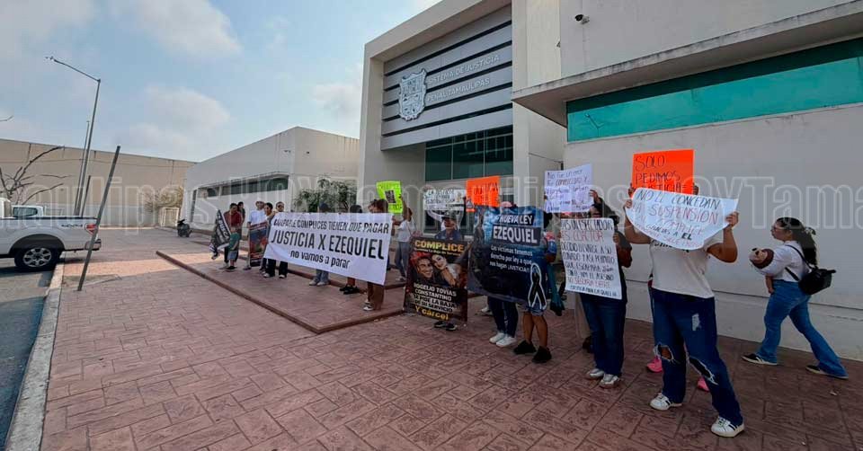 Altamira, Tamaulipas.-Eneri Balleza, viuda de Ezequiel, encabezó una manifestación pacífica en el Centro Integral de Justicia, acompañada de familiares y amigos, para exigir que no se otorguen beneficios legales al único detenido en el caso.