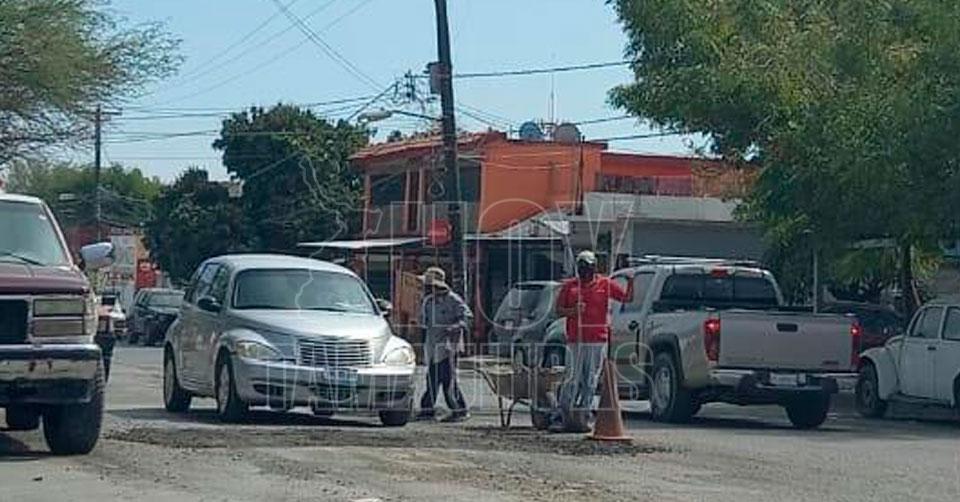 Jóvenes tapan baches en accesos a colonias de Ciudad Victoria