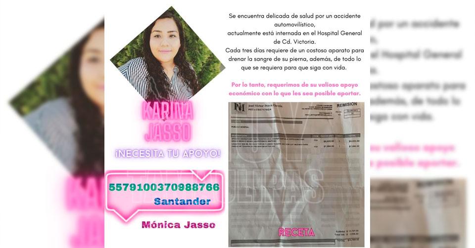 Piden apoyo para Karina Jasso en Ciudad Victoria; sufrió un accidente