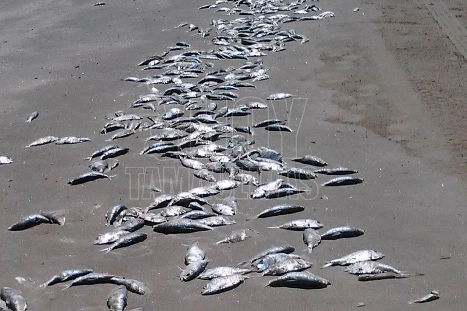 Llega marea roja a playa de Matamoros, miles de peces muertos